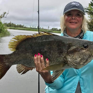 On the groups first day, the lads returned late in the afternoon with a hefty Barramundi catch but only 8 solid Black Bass, but still pumped with their first days lure tossing effort. The beers flowed freely into the humid night until the aroma of roast lamb lured the group indoors to the air conditioned comfort of the MV K20. Heavy rain throughout the night gave way to a steamy hot morning begging for some breeze that eventually did arrived around midday. Once again I ventured out for a quick lure trolling session with Alex to gain valuable experience navigating this vast water way and in the process managed to lure up 2 small Black Bass along with a huge Tilapia on a deep diving gold RMG scorpion.